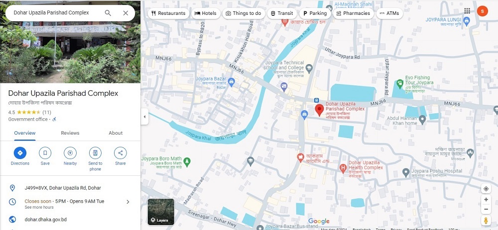 গুগল ম্যাপ লিঙ্ক : https://www.google.com/maps/place/Dohar+Upazila+Parishad+Complex/@23.6167944,90.1192215,17.76z/data=!4m6!3m5!1s0x37558fb27c0d7f85:0x70c28d595a122e80!8m2!3d23.6171751!4d90.1217869!16s%2Fg%2F11gfjgyw0f?authuser=0&entry=ttu